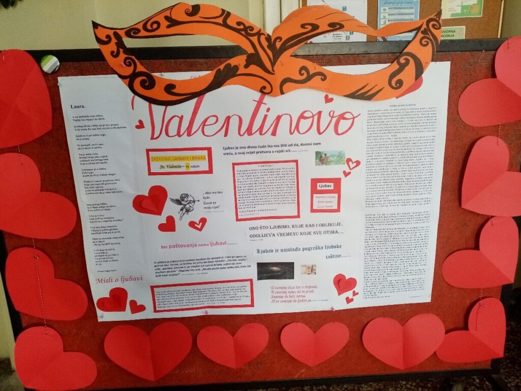 Maštovitu i veselu kreaciju plakata za Valentinovo (14.2.2025.), ispred naše knjižnice, osmislile su i izradile učenice 1.e razreda – Hana Blažičko Petak, Katja Štrosar, Dora Schwarzwald i Sara Pavičić. Plakat  obuhvaća misli o ljubavi i prijateljstvu poznatih filozofa i pjesnika. Ipak najveći dar za ovu prigodu je pristanak učenika da objelodane prikaz vlastitog duhovnog i intelektualnog bogatstva literarnog  izričaja. Pročitajte radove Novak Rakek Lane (1.b), Noele Katunarić (2.c) te anonimne učenice drugog razreda. Radovi su izričito nastali za izradu ovog plakata.