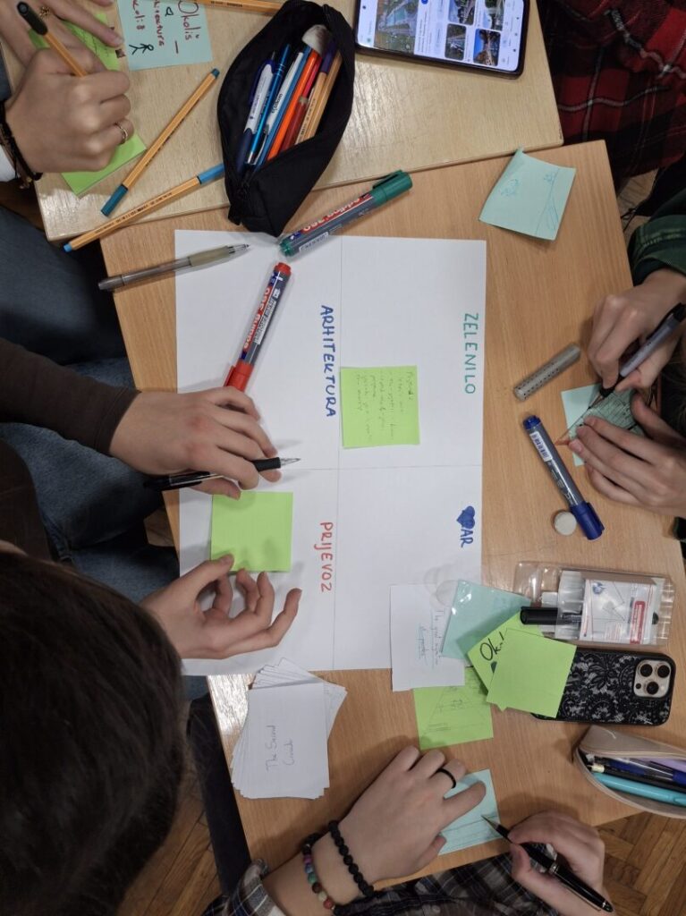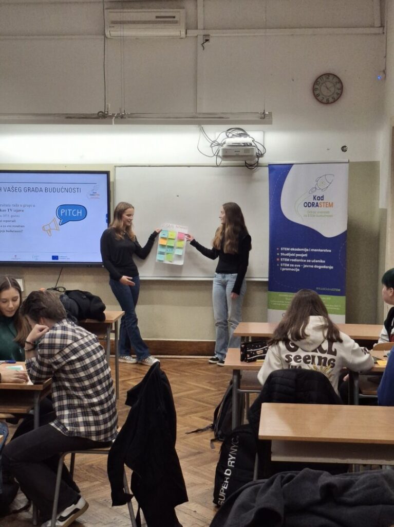 U drugom dijelu radionice učenici su dobili zadatak da u timovima osmisle gradove budućnosti – kako će se 2075. godine gradovi projektirati, kako će se stanovnici kretati, komunicirati i provoditi slobodno vrijeme.