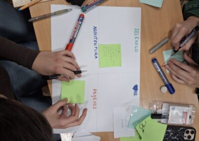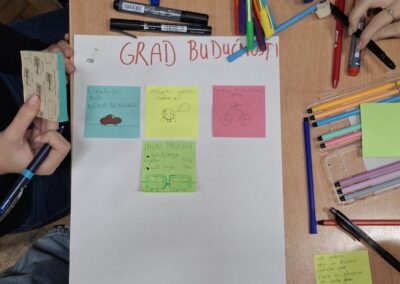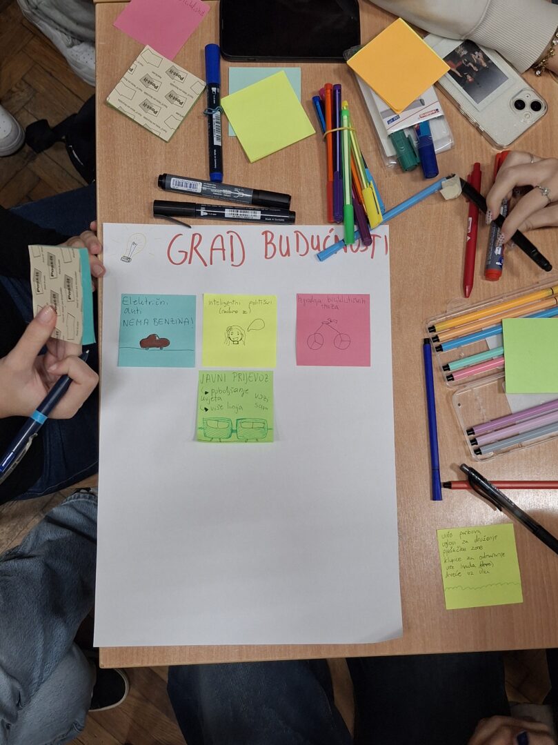 U drugom dijelu radionice učenici su dobili zadatak da u timovima osmisle gradove budućnosti – kako će se 2075. godine gradovi projektirati, kako će se stanovnici kretati, komunicirati i provoditi slobodno vrijeme.